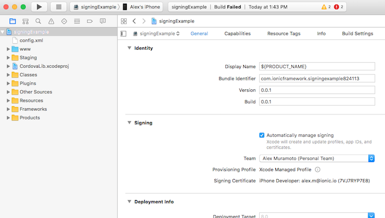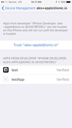 Unlike Android, iOS developers need to generate a provisioning profile to code sign their apps for testing. The good news is that, as of iOS9, you can develop and test your apps on your iOS device without a paid Apple Developer account. This is particularly great for developers who want to try out mobile development with Ionic, since it saves the cost but still provides a lot of the features of having a full Apple Developer account. For a full breakdown of the features included, check out Apple’s docs.