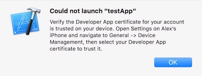 Once you’ve code signed your app, you should get a launch error that looks like this. On Xcode 7 and below you’ll see this automatically. On Xcode 8 it will appear the next time you try to run the app: