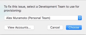 Click the ‘Fix Issue’ button, then select your ‘Personal Team’ profile.